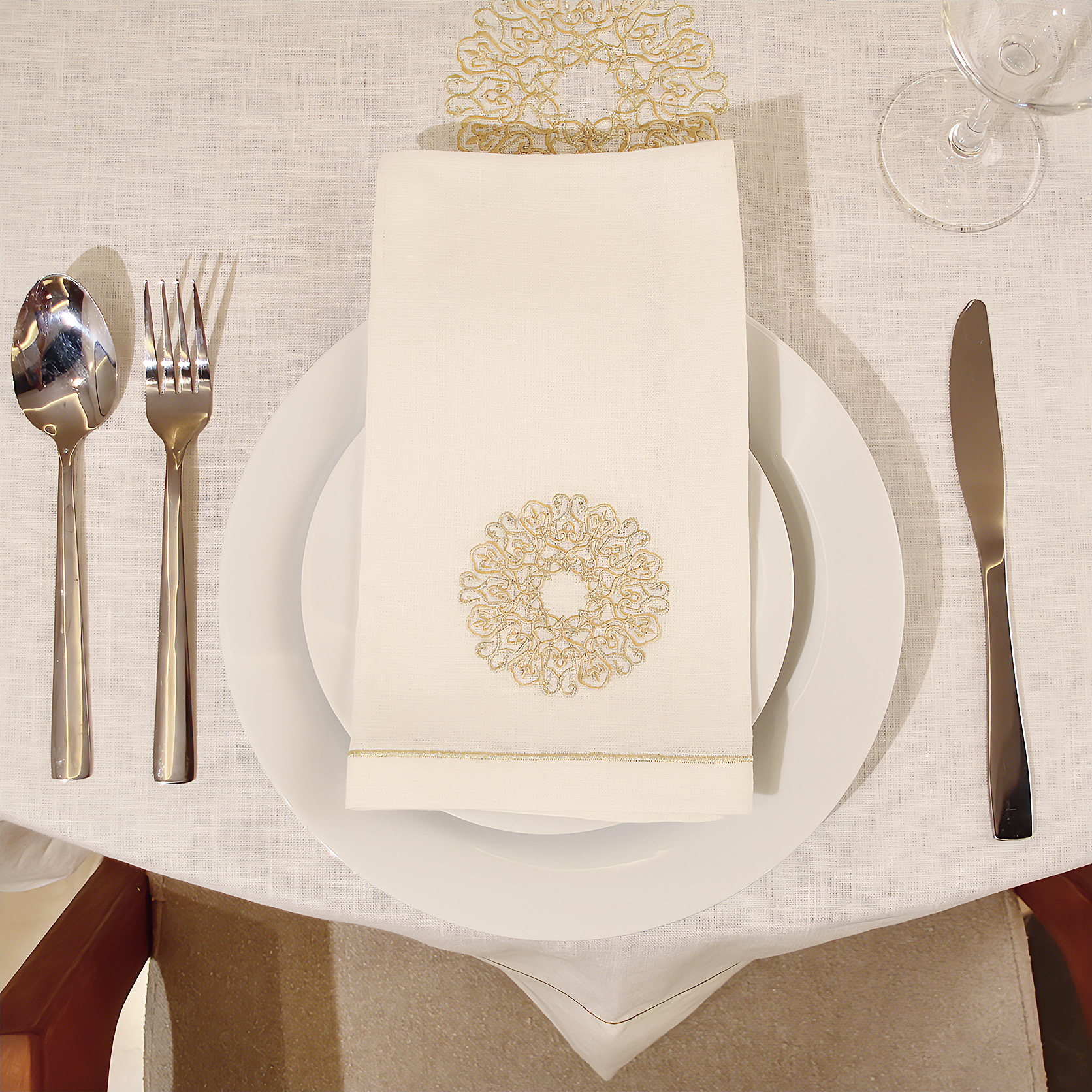 Transformez vos repas en véritables cérémonies grâce à cette somptueuse nappe en lin brodé de fils dorés. Avec ses dimensions généreuses de 180×180 cm, elle s’accompagne de 12 serviettes assorties pour une table élégamment coordonnée. Alliant charme artisanal et noblesse des matériaux, elle incarne le raffinement marocain dans toute sa splendeur.