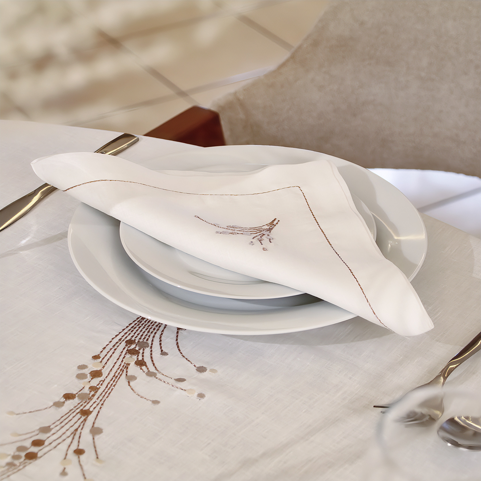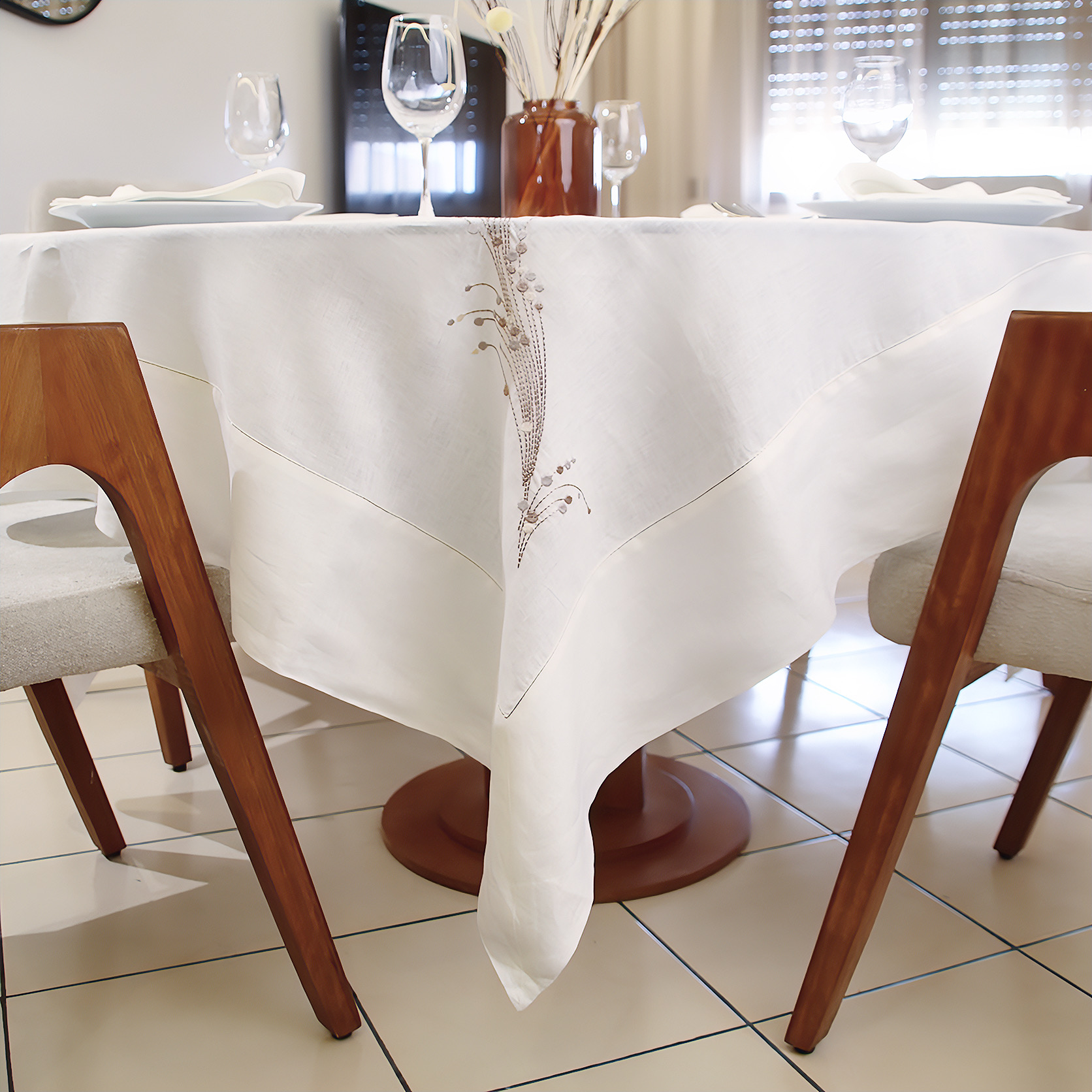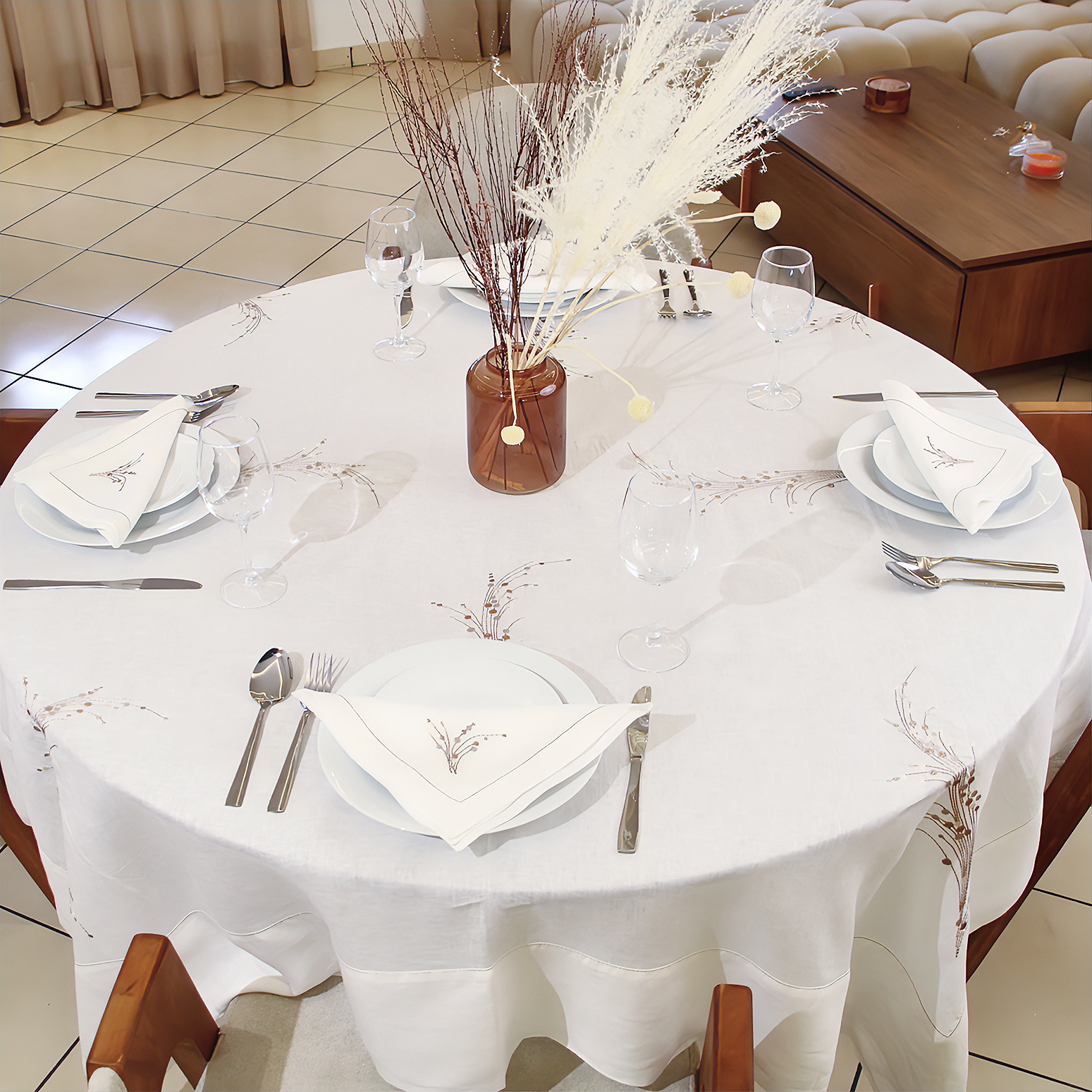 Célébrez l'art de la table avec notre linge de table "Moisson Chic Lin". Confectionnée en lin naturel, elle offre une élégance authentique, rehaussée par une broderie délicate de motifs de blé couleur bronze. Cet ensemble comprend une nappe de 180x180 cm (parfaite pour tables rondes ou carrées) et 12 serviettes assorties, pour des repas conviviaux et raffinés. Possibilité de confection sur mesure — prévoir un délai de livraison de 15 jours pour une pièce parfaitement adaptée à vos envies.
