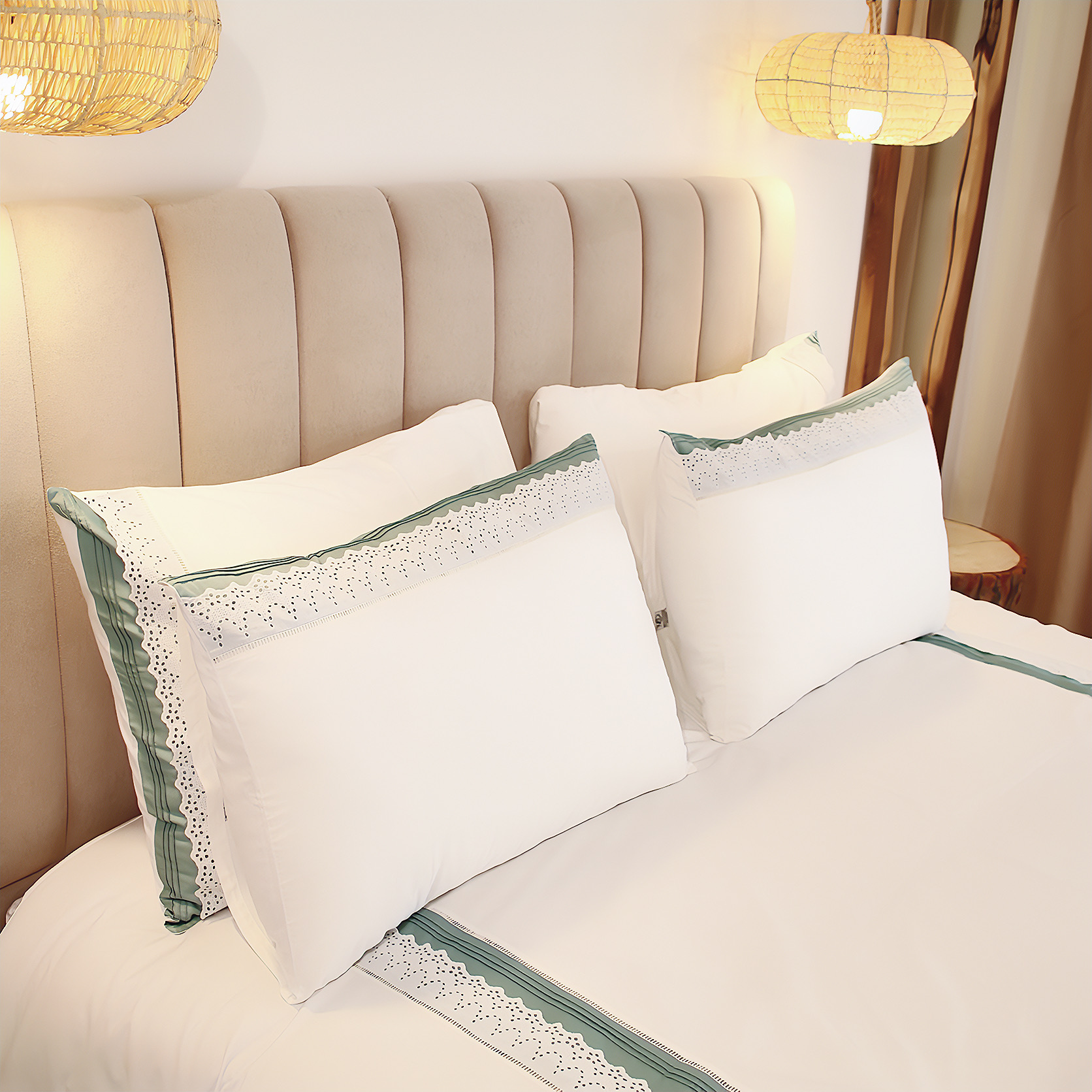 Offrez aux jeunes mariés cette parure incarne l’élégance avec ses finitions en dentelle et ses surpiqûres raffinées. Conçue en coton satiné d’exception, elle évoque une véritable symphonie textile, parfaite pour célébrer les débuts d’une vie à deux dans un cocon de luxe sur-mesure.Cet ensemble comprend un drap plat, un drap housse et deux taies d'oreillers 50x70 cm, conçus pour envelopper les lits de 160x200 cm et 180x200 cm d'un confort aérien et d'une élégance intemporelle. Sur-mesure disponible sous 15 jours, pour une adaptation parfaite à vos envies et à votre intérieur.