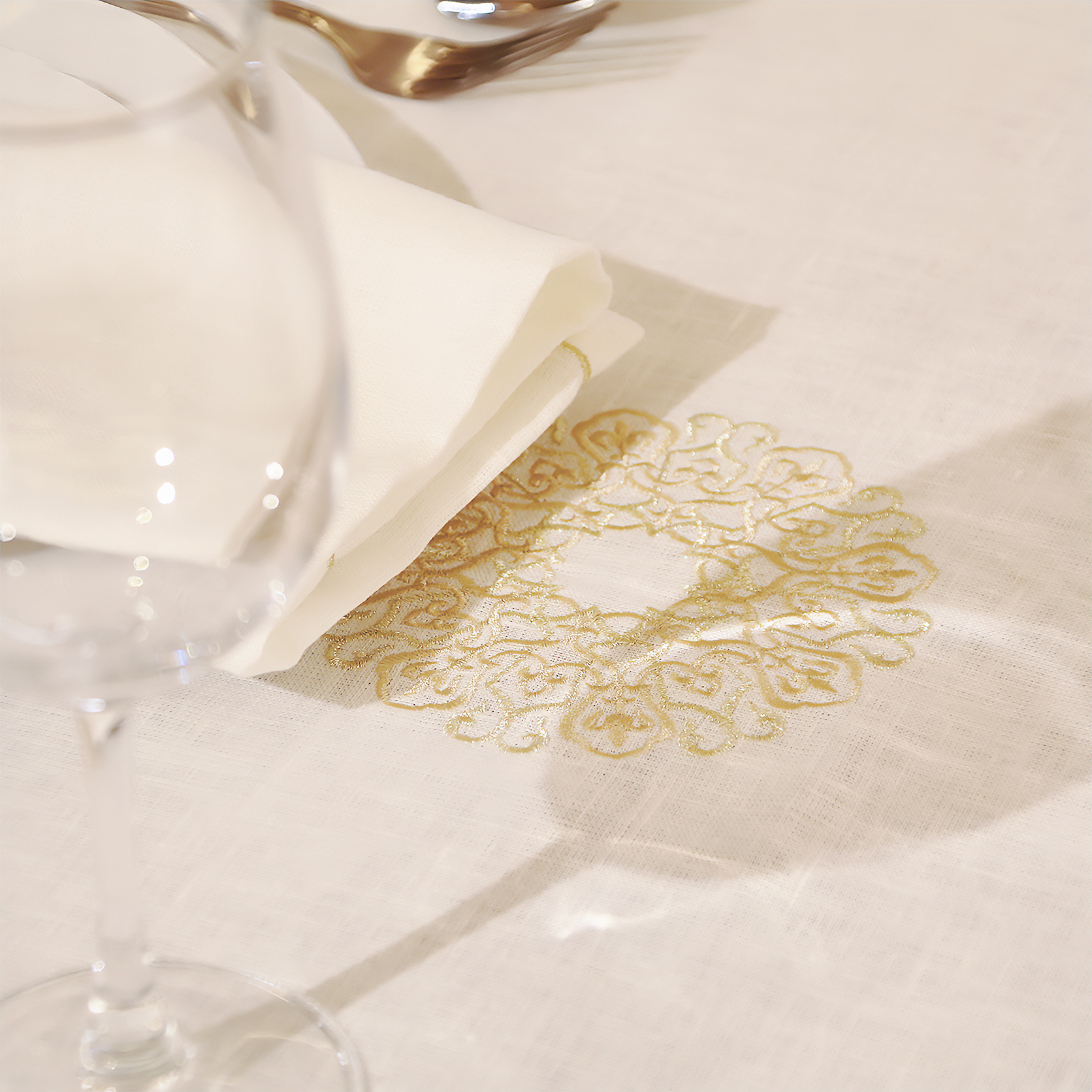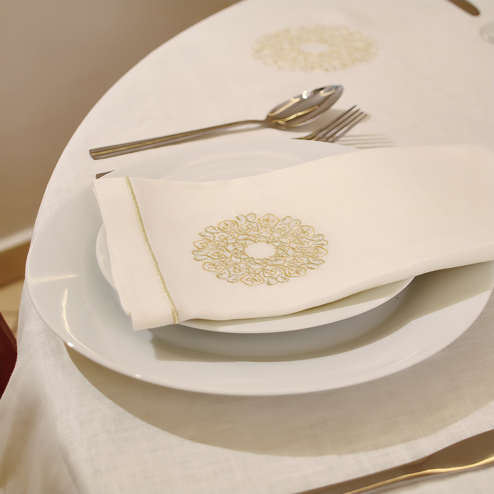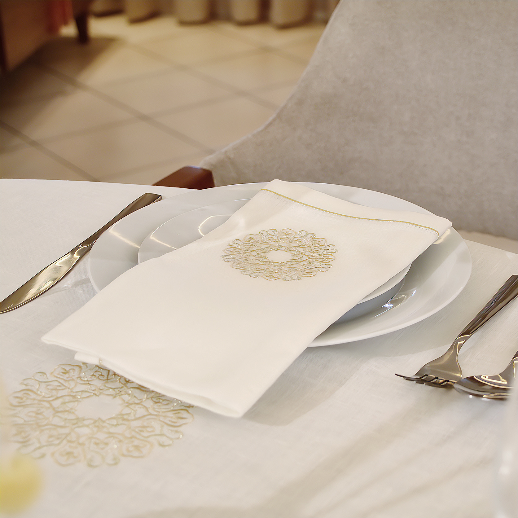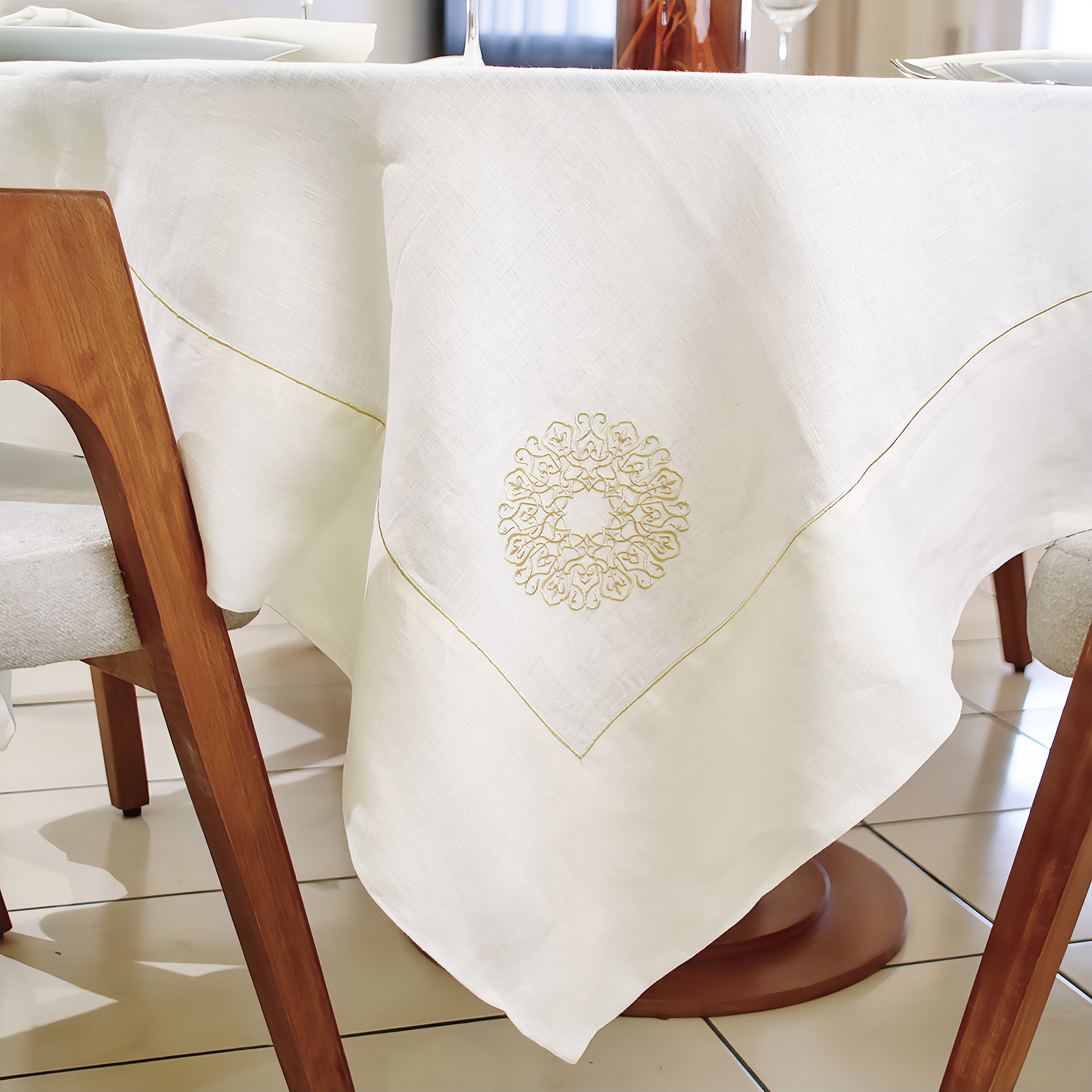 Transformez vos repas en véritables cérémonies grâce à cette somptueuse nappe en lin brodé de fils dorés. Avec ses dimensions généreuses de 180×180 cm, elle s’accompagne de 12 serviettes assorties pour une table élégamment coordonnée. Alliant charme artisanal et noblesse des matériaux, elle incarne le raffinement marocain dans toute sa splendeur.