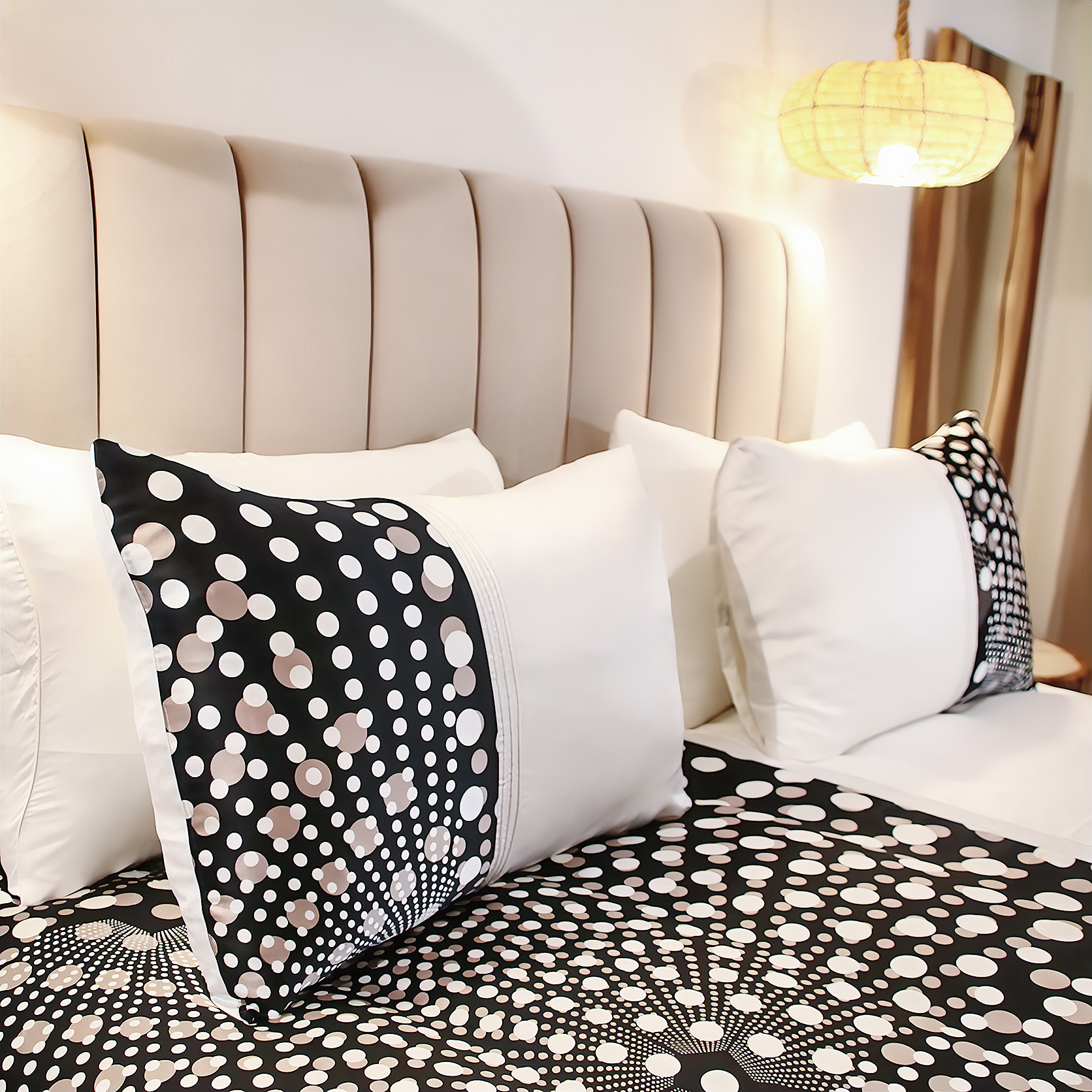 Réveillez le style de votre chambre avec notre parure "Explosion Nocturne Pure Soie". Confectionnée en soie luxueuse, elle offre une douceur incomparable et un éclat raffiné. Son motif imprimé audacieux de points en noir et blanc crée un design captivant et moderne. Cet ensemble comprend une housse de couette (240x260 cm) et deux taies d'oreiller 50x70 cm, idéalement adaptés aux lits de 160x200 cm et 180x200 cm. Sur-mesure disponible sous 15 jours, pour une adaptation parfaite à vos envies et à votre intérieur.